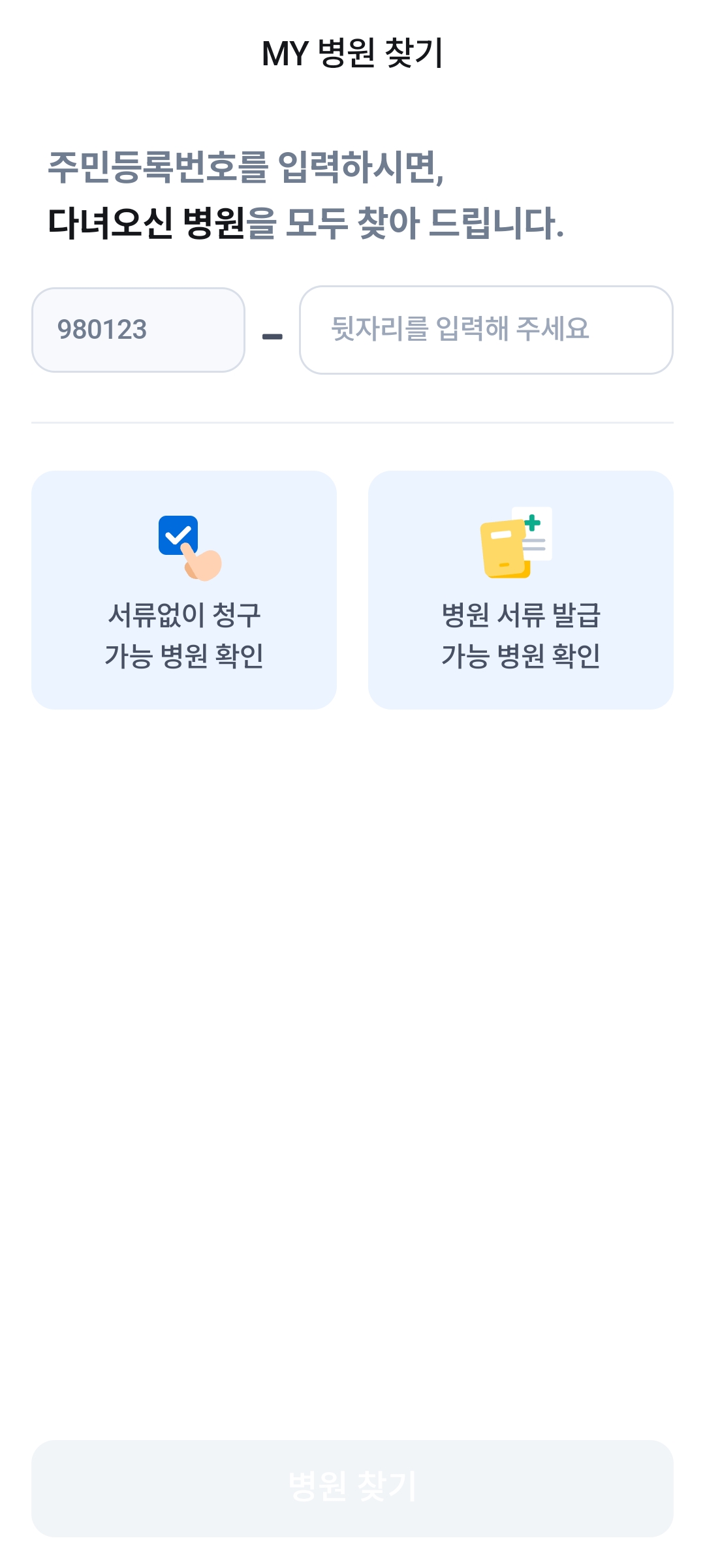 청구의 신 회원가입을 한 뒤 주민등록번호를 입력하면 (청구의 신 계약 병원 한정) 다녔던 병원 내역을 알 수 있다.