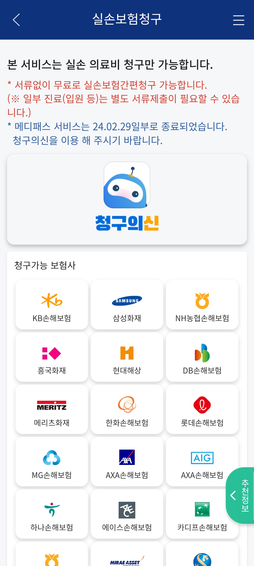 청구의 신 어플 설치 하라고 나온다. 아래는 가능한 보험사니 참고하면 된다. 난 우체국 보험이라 해당이 안되지만 혹시 보험청구가 안된 내용이 있을까싶어 설치해봤다.