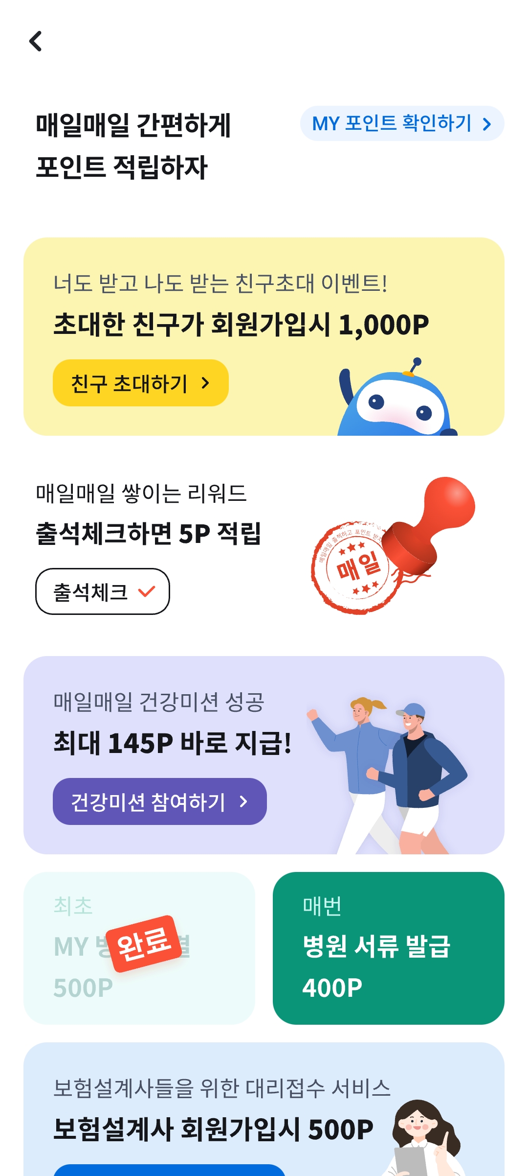 출석 체크나 병원 서류 발급 등을 하면 포인트를 적립받을 수 있으니 청구할 내용이 많을 때 이를 이용하면 좋을 것 같다.