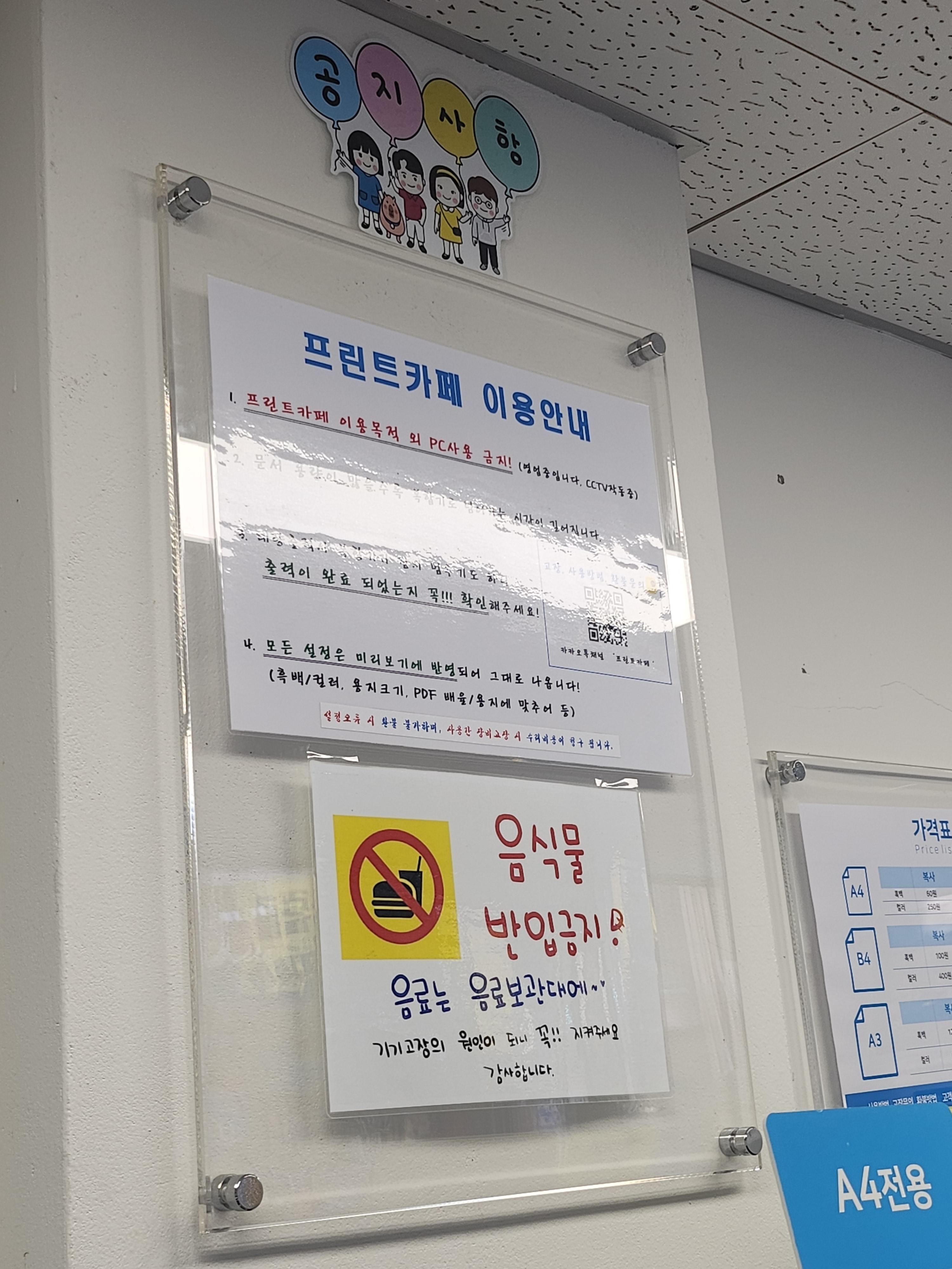 이용 안내 한번 읽어준다. 음식물 반입금지! 프린트 이용 목적 외 다른 업무 금지! 당연한 사항이니 이를 어기는 경우는 없도록 한다.