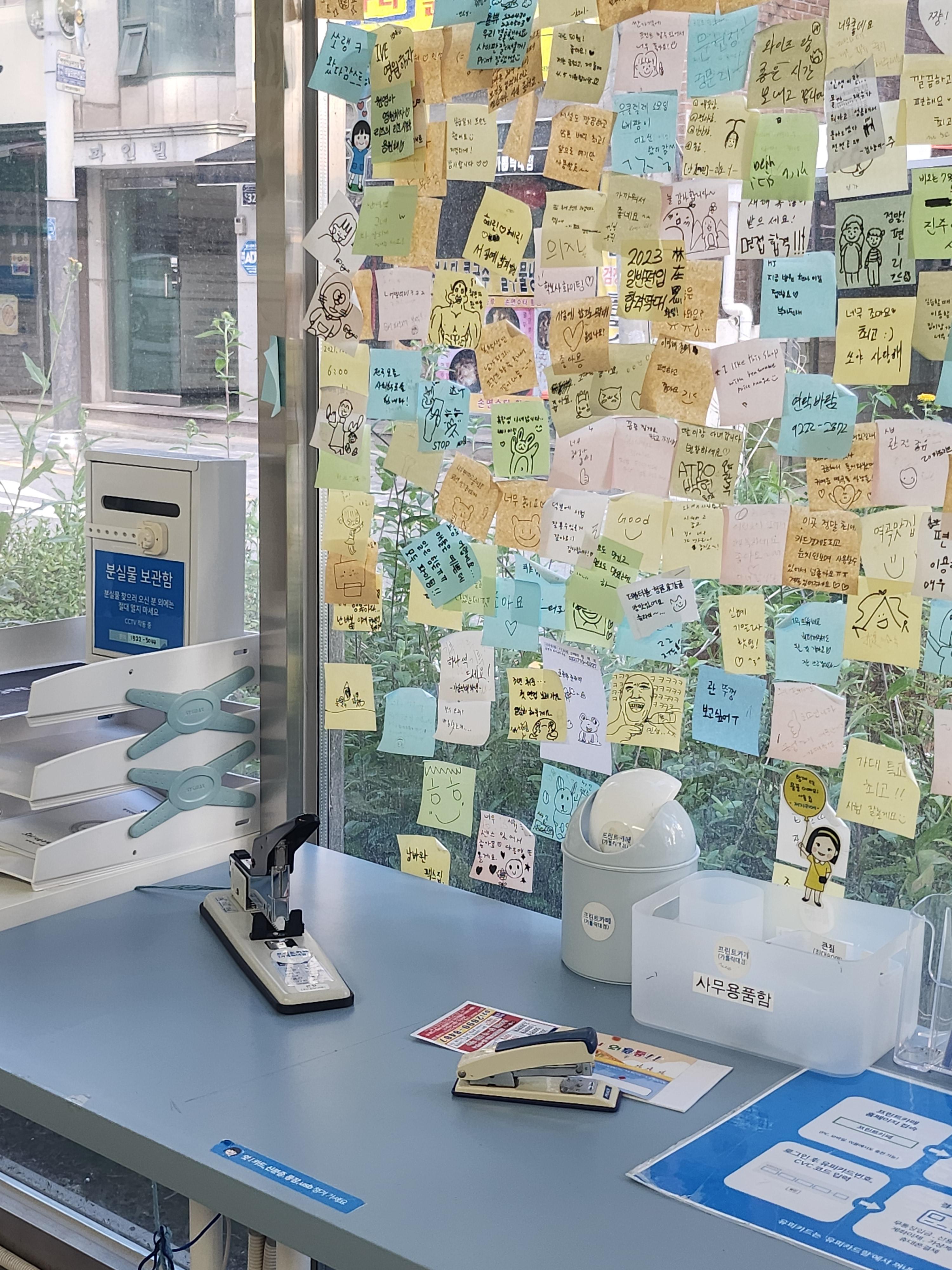 뒤에는 간단한 사무용품이 있어 문서 정리할 때 편할 것 같다. 유리창엔 하고싶은 말을 적을 수 있는 아날로그감성 메모존도 있다.