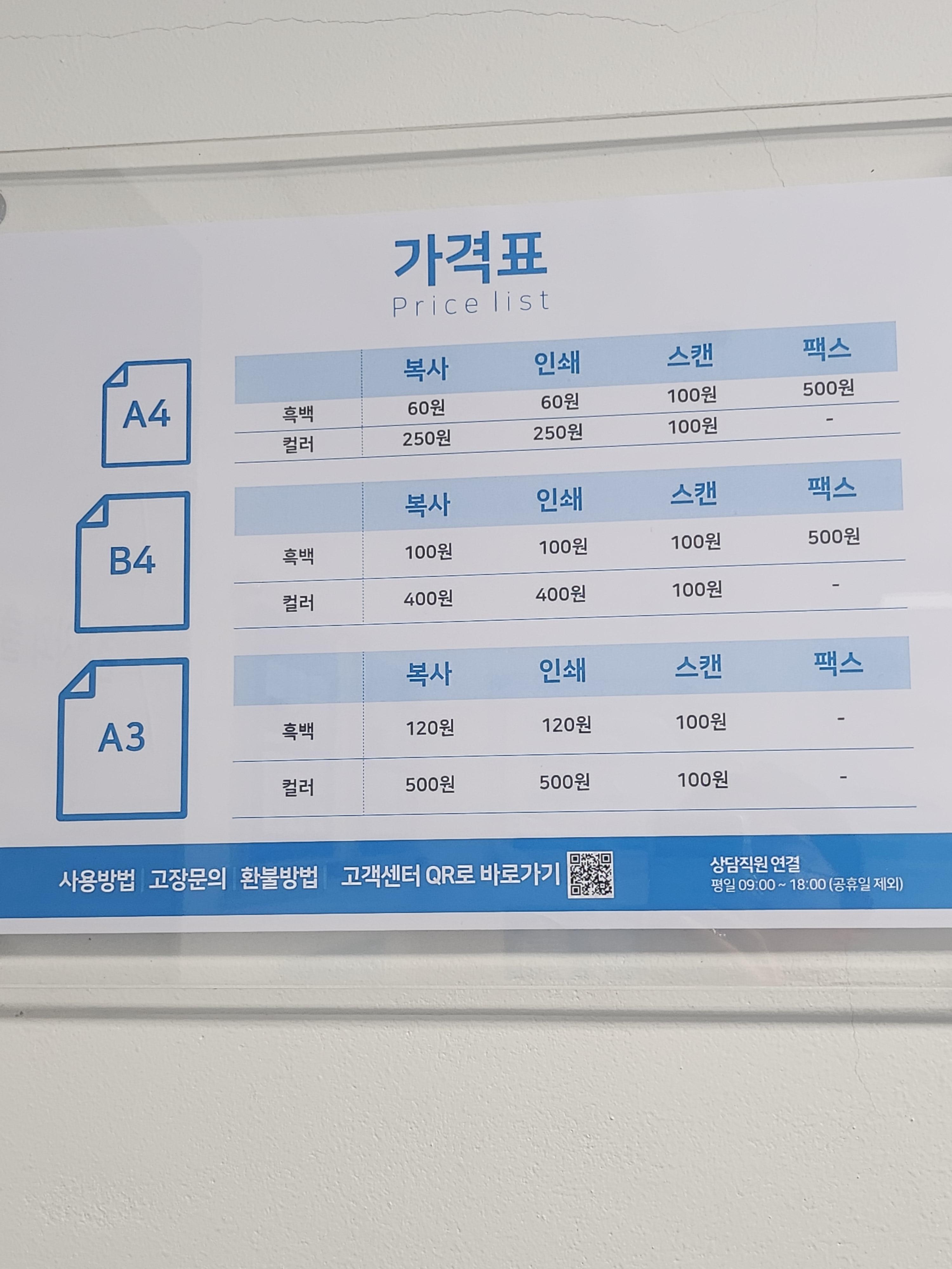 가격은 용지 크기와 흑백, 컬러에 따라 다르다.