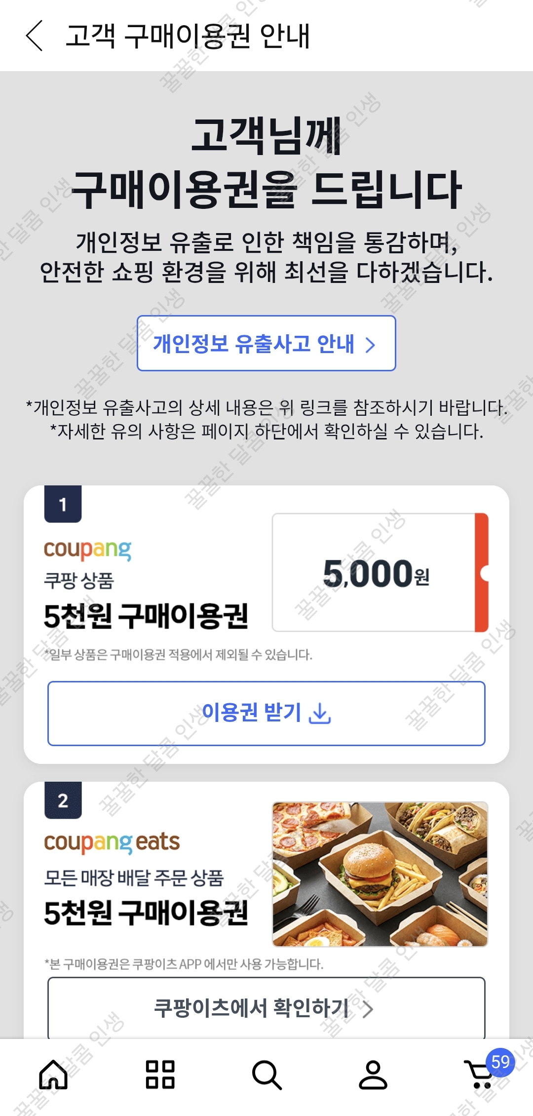 보상으로 지급된 캐시나 쿠폰은 유효기간이 있을 수 있으니, [마이쿠팡] > [할인쿠폰] 메뉴에서 유효기간을 꼭 확인하세요!
