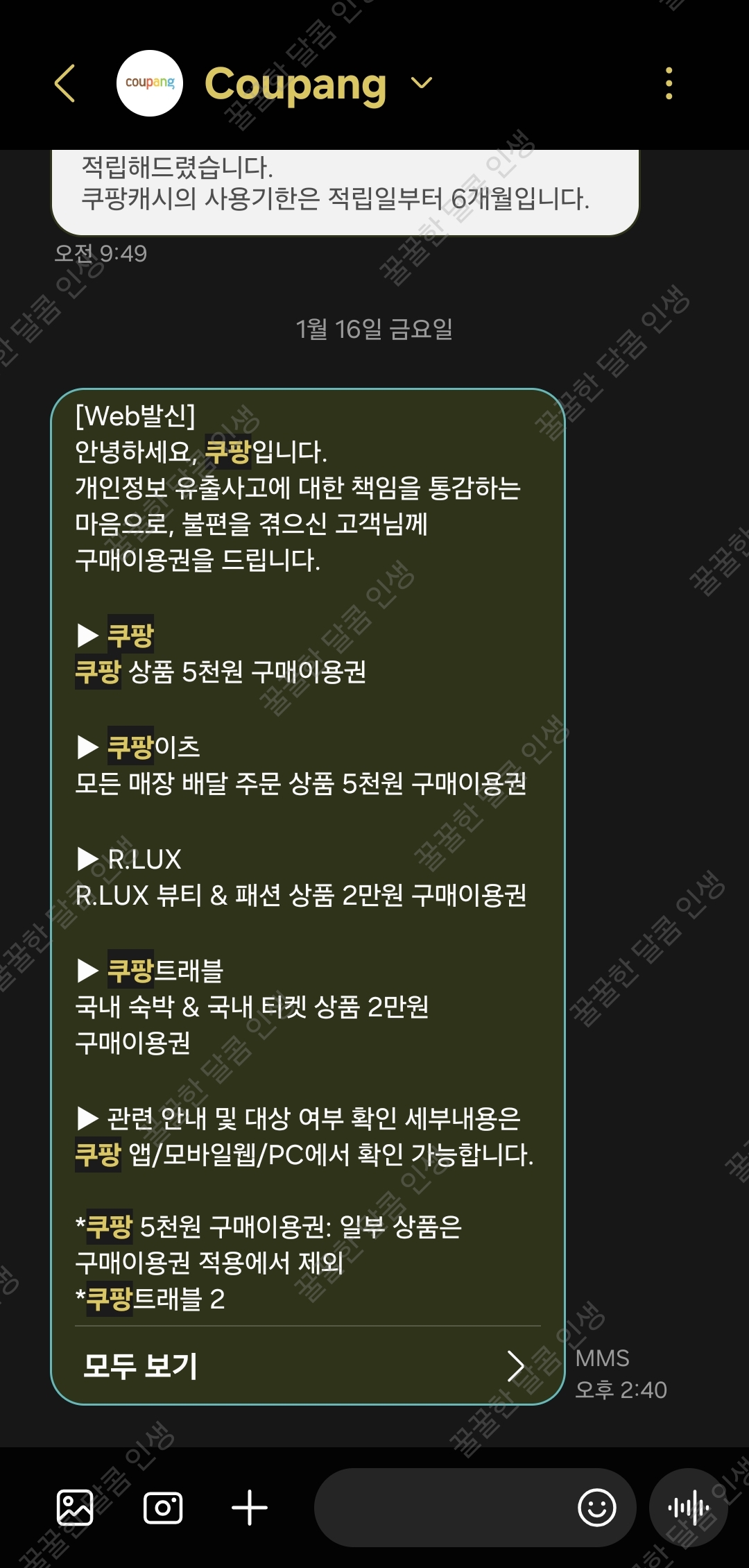 쿠팡에서 온 문자는 이렇습니다. 이외 쿠팡 보상과 관련된 문자는 무시해 주세요.
