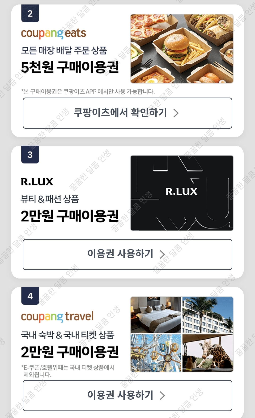 쿠팡상품 5천 원, 쿠팡이츠 5천 원, 뷰티패션 2만 원, 국내 숙박&티켓 2만 원 이용권을 받을 수 있습니다.
